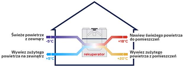 Podstawę systemu rekuperacji stanowi rekuperator z wymiennikiem służącym do odzysku ciepła. System rekuperacji działa dwukierunkowo. Z jednej strony zaciąga z zewnątrz świeże powietrze, które po przejściu przez filtry wtłaczane jest do pomieszczeń. Z drugiej strony system wyciąga z wewnątrz pomieszczeń zużyte powietrze. Strumienie powietrza poruszają się w oddzielnych przewodach wentylacyjnych dzięki czemu nie mieszają się ze sobą. Główną zaletą rekuperacji jest wymiana ciepła, ogrzane powietrze wyciągane z pomieszczeń przekazuje swoje ciepło do czystego powietrza zaciąganego z zewnątrz. Dzięki temu możemy cieszyć się świeżym powietrzem w domu bez strat cieplnych.